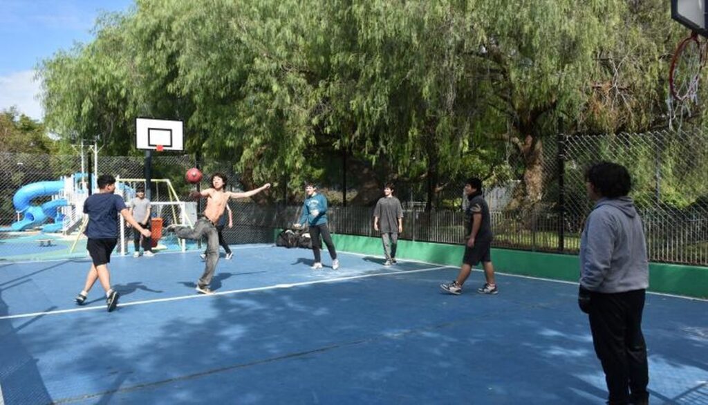 En paralelo, la cancha de básquet fue ampliada hacia el lateral, lo que mejoró sus proporciones. También se realizó una puesta en valor integral con nueva demarcación, pintura del solado, renovación de arcos y del cerramiento perimetral. Como parte de la obra, se reubicó el acceso: se eliminó la entrada desde el patio de juegos y se generó un ingreso independiente por la calle Estados Unidos, lo que permitió individualizar los dos sectores y mejorar su funcionamiento.