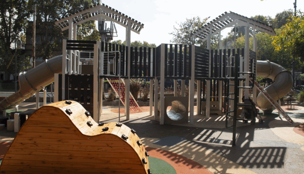 Según detallaron desde el Gobierno porteño a SECCIÓN CIUDAD, uno de los ejes principales de la obra fue la accesibilidad e integración total. Se incorporó un solado de caucho continuo, juegos inclusivos, circulaciones amplias y mobiliario accesible, pensados para niños de distintas edades y capacidades. Entre los nuevos elementos, se destacan el mangrullo refugio, un pórtico de madera cuádruple con butacón inclusivo, un soporte de equilibrio, troncos y puentes de madera, un trepador nube y paneles interactivos, además del trepador existente, que fue reubicado.
