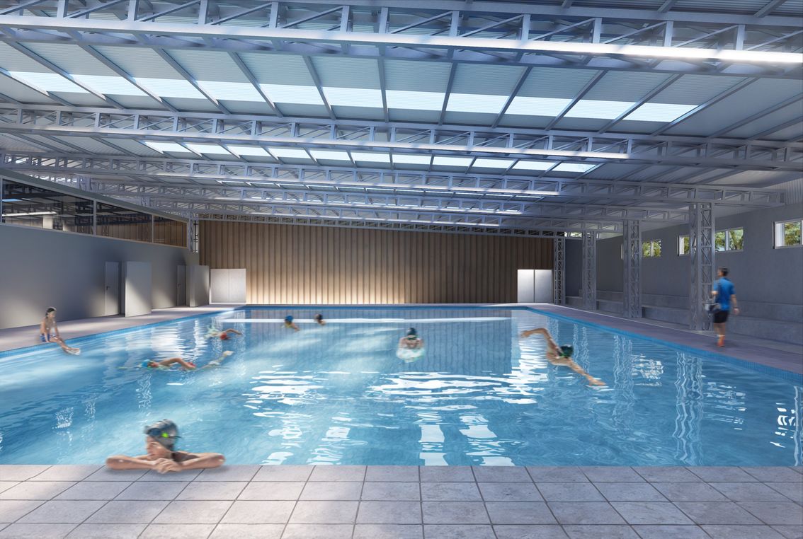 Durante este mes, se harán tareas de elevación de columnas y vigas en medianeras, construcción de las vigas metálicas de la cancha multideportes, elevación de la tabiquería interna de los vestuarios y natatorio y ejecución de revoques sobre mamposterías internas y de los contrapisos en los vestuarios.