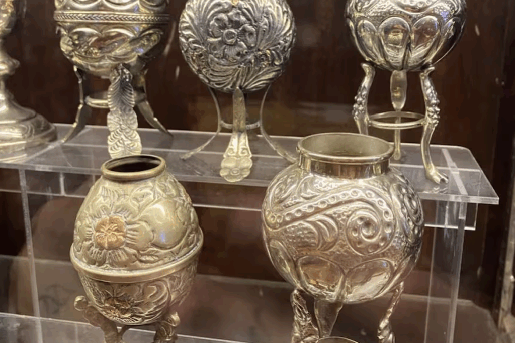 O el Mate de Platería Colonial con Estribo, como se llamaba la base ornamental que eleva el mate y aporta sofisticación a su diseño. En exhibición puede apreciarse ejemplares del siglo XVIII y XIX que reflejan el auge de la platería en el Río de la Plata, mayormente elaboradas por orfebres de renombre, y que eran símbolos de riqueza y estatus.