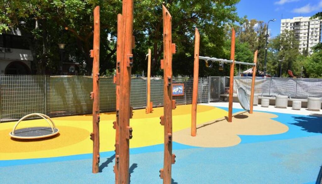Para ello, se creó un nuevo acceso que ordenó la circulación y dividió el espacio en dos sectores: uno orientado a la destreza física —con un gran mangrullo, un pórtico de hamacas integrador, troncos trepadores y una calesita— y otro más tranquilo, con lomadas, paneles con relieves e información accesible mediante códigos QR, caballitos resorte y hamacas nido. A su vez, se incorporó un espacio de calma junto al ingreso, separado por un cantero sensorial y acompañado por un sector de estar.